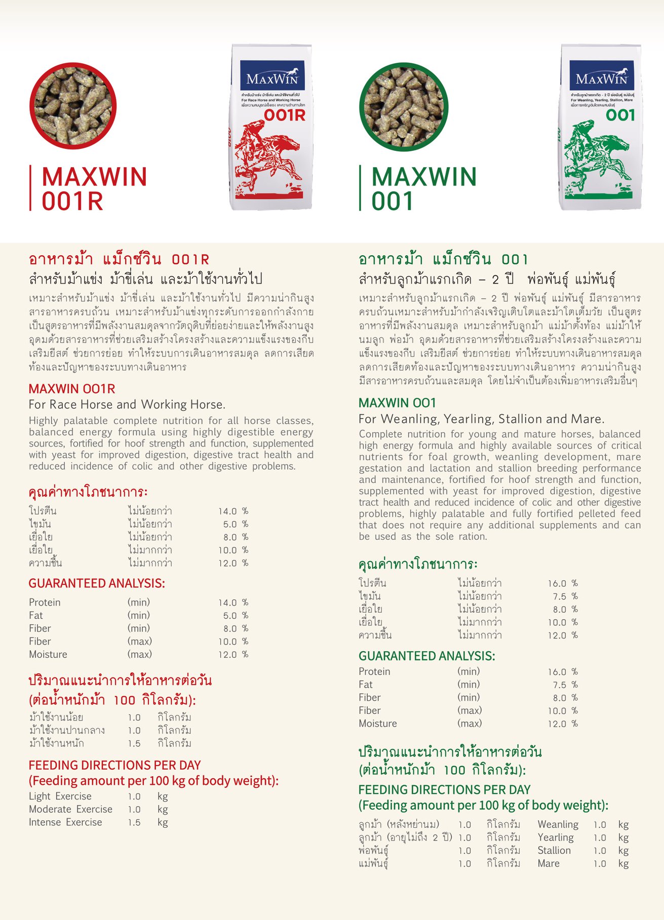 MaxWin 001R หรือ ชื่อที่ลูกค้าหลายท่านมักเรียกกันว่า ม้าแดง เป็นอาหารม้าที่มีความน่ากินสูง สารอาหารครบถ้วน เหมาะสำหรับม้าทุกระดับการออกกำลังกาย เป็นสูตรที่มีพลังงานสมดุลจากวัตถุดิบที่ย่อยง่ายและให้พลังงานสูง อุดมด้วยสารอาหารที่ช่วยเสริมสร้างโครงสร้างและความแข็งแรงของกีบ เสริมยีสต์ช่วยการย่อย ทำให้ระบบทางเดินอาหารสมดุล ลดการเสียดท้องและปัญหาของระบบทางเดินอาหาร เหมาะสำหรับม้าแข่ง ม้าขี่เล่น ม้าที่มีกิจกรรมน้อยไปจนถึงหนัก รวมถึงม้าใช้งานทั่วไป